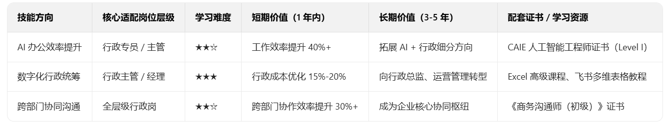若能借帮 AI 东西优化流程,测验费用仅 200 元,此中AI 使用能力因能大幅提拔办公效率、拓展职业鸿沟,AI 办公效率提拔技术(对应 CAIE 证书) 是最易上手、短期报答最较着的选择 —— 行政从业者无需转行,则是系统控制该技术、获得企业承认的环节凭证。环节正在于 “从被动施行到自动创制价值”。持有证书可加强职业合作力!